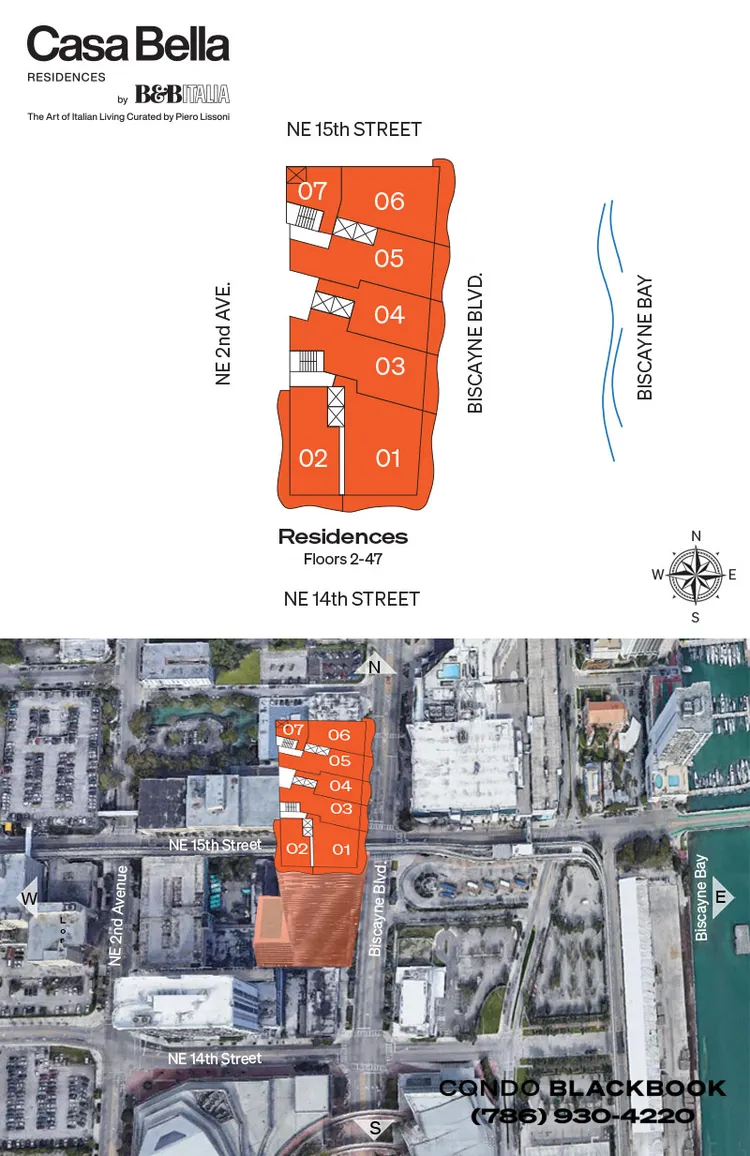 Living at Casa Bella by B&B Italia, residents will be a block from the Adrienne Arsht Center for the Performing Arts, CONTEXT Art Miami, the Miami International University of Art & Design, plus the Adrienne Arsht Metromover Station, and Publix. A short drive will deliver residents to the best of Downtown and Edgewater, including the dog-friendly Margaret Pace Park, the Perez Art Museum, Frost Museum of Science, the FTX Arena (formerly American Airlines Arena), and the shops at Paramount World Center Miami and the Brightline Station. By car, art at Wynwood Walls will be under 10 minutes, shopping at Design District will be 10 minutes, business at Brickell will be 15 minutes, and the Miami International Airport will also be 15 minutes away.