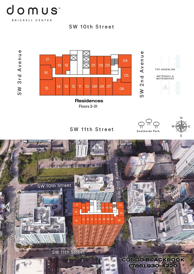 Owners and guests of Domus Brickell Center will enjoy conveniently living in the heart of Miami’s financial district just a block from The Underline, Miami's 10-mile linear park and urban trail, as well as the Metrorail and MetroMover to make car-free living a reality. Additionally, residents of Domus Brickell Center will be within walking distance of upscale shopping and dining at Brickell City Centre and Mary Brickell Village. Furthermore, the Kaseya Center is within a 15-minute drive, the Design District is within 20 minutes, the Miami International Airport is within 25 minutes, and the wonderful beaches of South Beach is within 25 minutes.